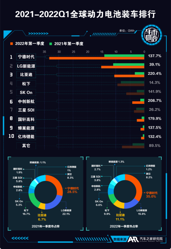 可以說,在全球動(dòng)力電池TOP10中,6家中國企業(yè)、3家韓國企業(yè)、1家日本企業(yè)已成常態(tài)。從最新的SNE Research 數(shù)據(jù)看,2022年一季度6家中國企業(yè)的全球動(dòng)力電池裝車量均同比增長100%以上,全球市場占有率也全部提升。