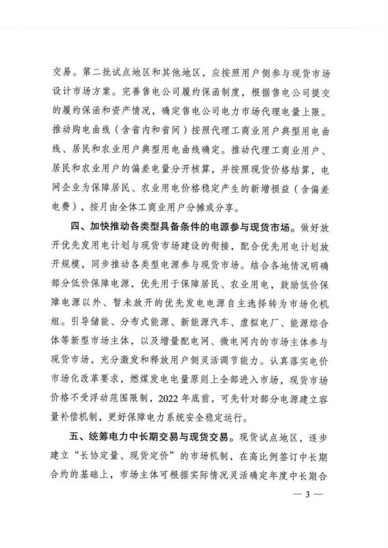 二是加快推動(dòng)各類型具備條件的電源參與現(xiàn)貨市場(chǎng)。做好放開優(yōu)先發(fā)用電計(jì)劃與現(xiàn)貨市場(chǎng)建設(shè)的銜接,配合優(yōu)先發(fā)用電計(jì)劃放開規(guī)模,同步推動(dòng)各類型電源參與現(xiàn)貨市場(chǎng)。引導(dǎo)儲(chǔ)能、分布式能源、新能源汽車、虛擬電廠等新型市場(chǎng)主體,以及增量配電網(wǎng)、微電網(wǎng)內(nèi)的市場(chǎng)主體參與現(xiàn)貨市場(chǎng),充分激發(fā)和釋放用戶側(cè)靈活調(diào)節(jié)能力。2022年底前,可先針對(duì)部分電源建立容量補(bǔ)償機(jī)制,更好保障電力系統(tǒng)安全穩(wěn)定運(yùn)行。