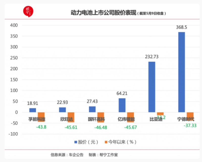 此外,從股價表現(xiàn)看,鋰電板塊已經(jīng)回調(diào)了一段時間。年初以來,Wind 鋰電池指數(shù)跌幅近 34%;個股方面,6 家動力電池上市公司 " 全軍覆沒 ",股價與年初相比均為下跌走勢,孚能科技、欣旺達、國軒高科、億緯鋰能接近 " 腰斬 ",寧德時代跌幅也超 30%。