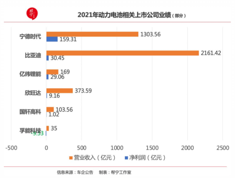 幫寧工作室統(tǒng)計了 6 家動力電池相關(guān)上市公司的財報發(fā)現(xiàn),2021 年它們?nèi)繉崿F(xiàn)營收增長,其中有 3 家營收翻倍,孚能科技營收增速達 2 倍以上,比亞迪和寧德時代破千億。