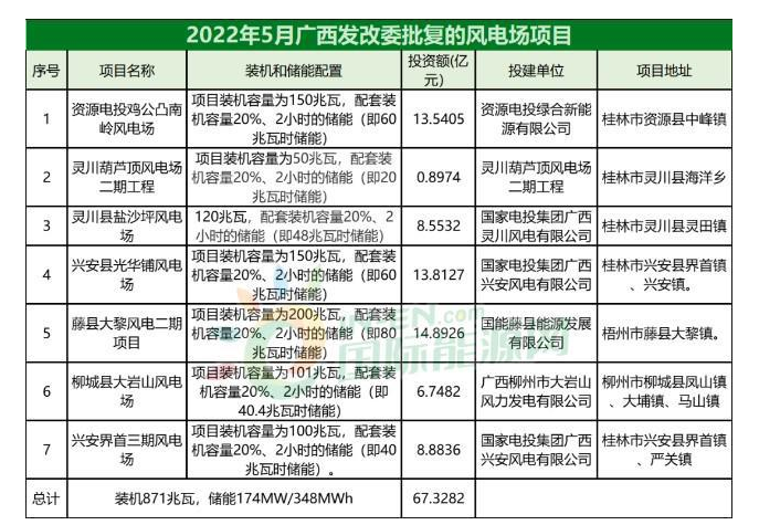 不止風(fēng)電儲能一體化項目,在廣西發(fā)改委批復(fù)的風(fēng)電場項目中,雖然項目名稱中沒有儲能二字,但是都提出了20%&2h的儲能配置要求。例如,5月剛過幾天已經(jīng)通過的風(fēng)電場項目: