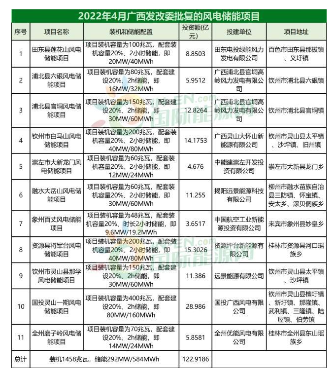 4月,廣西發(fā)改委批復(fù)11個風(fēng)儲一體化項目,儲能總規(guī)模達292MW/584MWh,投資總額超122億。項目開發(fā)商主要來自國家電投、中能建、遠景能源等。具體內(nèi)容如下:
