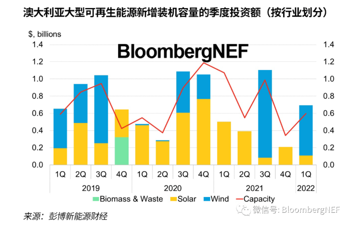 彭博新能源財(cái)經(jīng)估計(jì),2022年第一季度,澳大利亞大型可再生能源新增裝機(jī)容量獲得投資6.94億美元(9.5億澳元)——繼2021年第四季度微弱增長后,該季度環(huán)比增幅達(dá)到233%,且在2021年第一季度基礎(chǔ)上同比增長38%。據(jù)估計(jì),屋頂光伏等小型分布式裝機(jī)容量獲得投資8.05億美元。