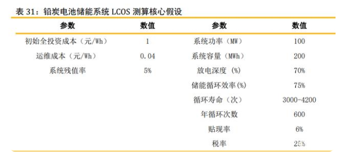 鉛炭電池儲能全壽命儲能度電成本(LCOS)測算核心假設: 1)初始投資成本:鉛炭電池儲能系統(tǒng)中電芯成本較低,假設初始全投資成本為 1 元 /Wh。 2)年度運維成本假設:每年需要4%左右,為0.04元/W。 3)放電深度:鉛炭電池放電深度較低,為60-70%。 4)壽命:可循環(huán)2000次以上,多家企業(yè)表示,其鉛炭電池可在70%放電深度條件下 達到4200次的循環(huán)壽命。 4)循環(huán)效率:綜合多種文獻,鉛炭電池循環(huán)次數(shù)可以達到70-85%,這里暫定75%, 部分可達80%以上。 5)貼現(xiàn)率:考慮到當前央企能源企業(yè)的融資成本在4-5%,我們選取6%作為折現(xiàn)率。