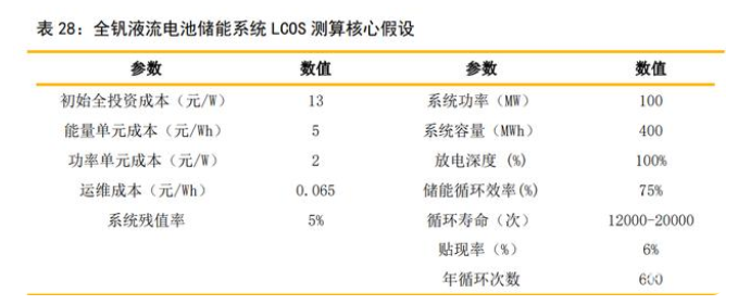 全釩液流電池儲能全壽命儲能度電成本(LCOS)測算核心假設: