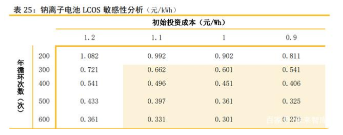由于產業(yè)尚未應用,我們假設在相對成熟階段,在初始投資成本1.1元/Wh,年均循 環(huán)次數(shù)300次,壽命為10年, LOCS為0.661元/kWh,與磷酸鐵鋰電池相當。