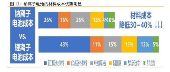 相關研究表明,綜合正極材料、負極材料和集流體幾個方面,鈉離子電池材料成本 約370元/kWh,而且隨著產業(yè)鏈成熟,材料成本有望進一步下探,結合結構件好電氣件成 本,初始容量投資有望控制在500-700元/kWh;性能方面,隨著研發(fā)持續(xù)投入和技術迭代, 電池循環(huán)壽命有望突破8000次以上。