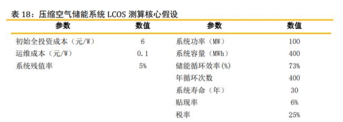 壓縮空氣儲能全壽命儲能度電成本(LCOS)測算核心假設: 1)初始投資成本:綜合多種文獻,壓縮空氣初始投資成本在 6-7.5 元/瓦之間, 100MW 級別的成本預計可以達到 6000 元/kW 以下。我們假設 100MW/400MWh 的項目單位投 資成本為 6 元/W。 2)年度運維成本假設:壓縮空氣儲能所需的維修保養(yǎng)成本相對較高,每年需要2%左 右。我們假設運維成本為0.1元/W。 3)系統(tǒng)壽命假設:壓縮空氣產能電站的主體設施可以使用30-50年,我們這里保守 預測30年的運營壽命。 4)循環(huán)效率:壓縮空氣儲能系統(tǒng)的能量利用效率近年來快速上升,大容量電站效率 已經可以達到70%,先進儲能項目可以達到75%。5)循環(huán)次數(shù):電站一般可以每天全容量沖放1-2次,對應年循環(huán)次數(shù)350-700次,循 環(huán)次數(shù)越高,系統(tǒng)度電成本越低。 6)貼現(xiàn)率:考慮到當前央企能源企業(yè)的融資成本在4-5%,我們選取6%作為折現(xiàn)率。