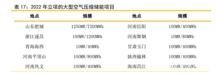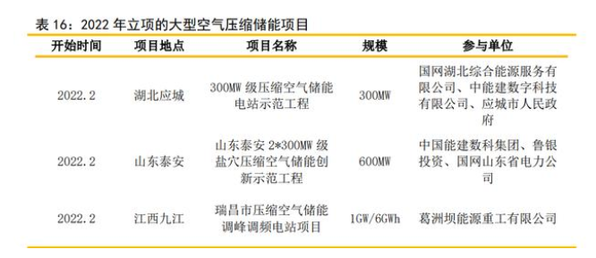 2022年以來大功率項目開始快速上馬。2022年2月,湖北應城300MW(兆瓦)級壓縮 空氣儲能電站示范項目簽約活動;山東省泰安市推進開發(fā)600MW(20MW)級鹽穴壓縮空氣 儲能電站;葛洲壩能源重工有限公司擬位于瑞昌市投資約80億元,建設規(guī)模為 1000MW/6000MWh的壓縮空氣項目。