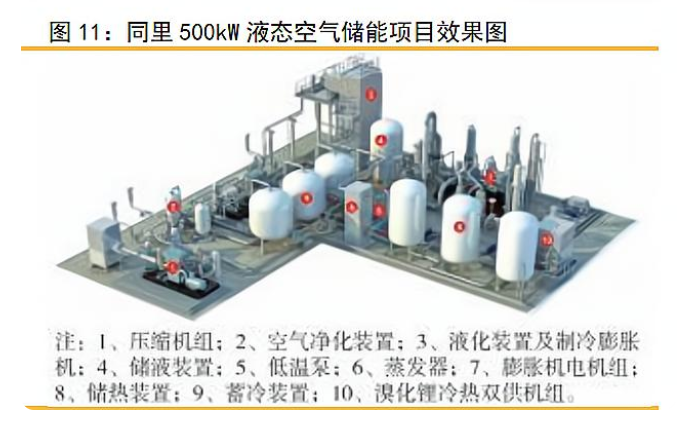 壓縮空氣系統(tǒng)構成。壓縮空氣主要由壓縮系統(tǒng)、膨脹系統(tǒng)、發(fā)電及以及儲氣罐四大 核心部分。根據(jù)同里500kW液態(tài)空氣儲能項目效果圖,目前先進的液態(tài)空氣儲能主要涉 及設備包括:1)壓縮機組,2)空氣凈化裝置,3)液化裝置及制冷膨脹機,4)儲液裝置,5)低溫泵,6)膨脹劑電機組,7)膨脹機電機組,8)儲熱裝置,9)蓄冷裝置,10) 溴化鋰冷熱雙供機組。