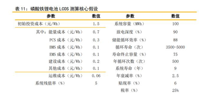 (3) 系統(tǒng)殘值率假設:系統(tǒng)殘值是儲能系統(tǒng)報廢的剩余價值減去處置成本所得到的凈值,根據(jù)電池類型不同占初始投資成本的3%-40%不等。其中磷酸鐵 鋰電池相較其他類型電池回收價值較低,我們假設其系統(tǒng)殘值率為5%。