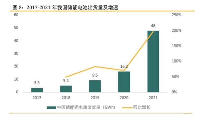 《關于鼓勵可再生能源發(fā)電企業(yè)自建或購買調峰能力增加并網規(guī)模的通知》強調了 儲能重要性,規(guī)定了市場化規(guī)模要求自行配置15%*4小時,保障性規(guī)模由電網負責消納, 未對保障性規(guī)模內的配儲作出具體要求,但是我國絕大多數(shù)省份都已經對風電、光伏電 站相關儲能設施建設要求,多數(shù)省份要求強制建設10%-20%功率,時長2小時的儲能。在 強制配儲政策的刺激下,我國儲能行業(yè)需求出現(xiàn)了井噴現(xiàn)象,行業(yè)快速壯大。