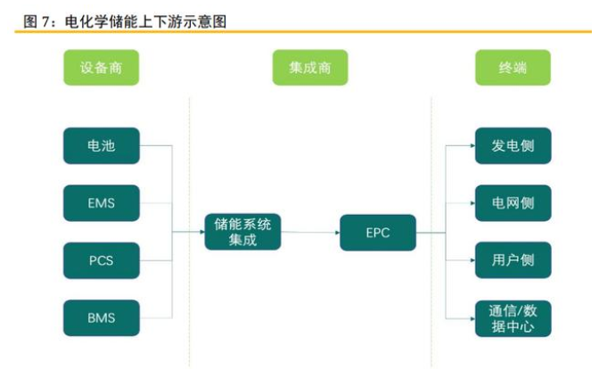 鋰離子儲能產業(yè)鏈由上游設備商,中游集成商和下游終端用戶組成。其中設備包括 電池、EMS(能量管理系統(tǒng))、BMS(電池管理系統(tǒng))、PCS(變流器);集成商包括儲能 系統(tǒng)集成和EPC;終端用戶則由發(fā)電側、電網側、用戶側以及通信/數(shù)據(jù)中心組成。