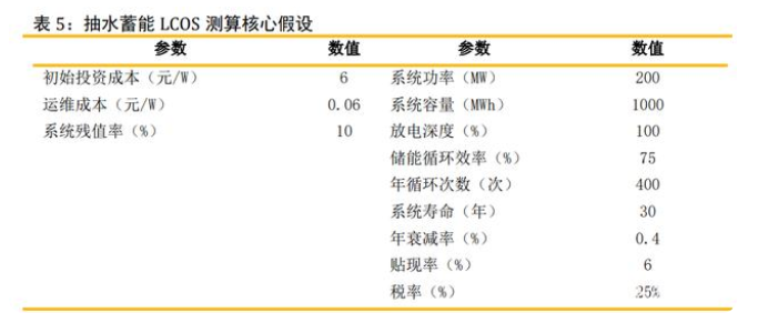 抽水蓄能全壽命儲能度電成本(LCOS)測算核心假設: