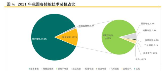 2021年我國電化學儲能裝機中,鋰離子電池占比高達89.7%,是目前技術比較成熟, 發(fā)展勢頭最為迅猛的儲能方式。鋰離子電池由正極、負極、隔膜和電解液組成,目前主 流產品正極常用鎳錳鈷三元材料或磷酸鐵鋰,負極多為石墨等碳素材料。鋰離子電池具 有能量密度大、沒有記憶效應、充放電快速、響應速度快等優(yōu)點,廣泛應用于風電光伏 等新能源發(fā)電側配儲和用戶側儲能項目。