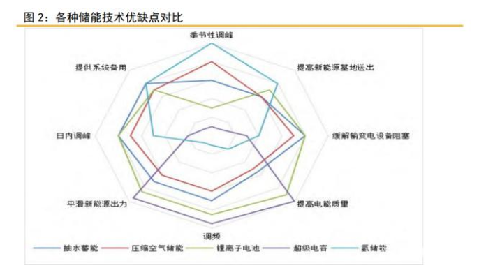 儲能技術種類繁多,特點各異。實際應用時,要根據(jù)各種儲能技術的特點以及對優(yōu) 缺點進行綜合比較來選擇適當?shù)募夹g。各類儲能均具有獨特屬性,氫儲能更適宜季節(jié)性 調峰;抽蓄、壓縮空氣儲能、燃料電池、電化學儲能等更適合小時級調峰;超級電容等 則更適合秒級調頻需求。 各類儲能技術中,抽水蓄能是應用最為成熟;儲熱技術也已處于規(guī)?;瘧秒A段, 目前我國火電靈活性改造大部分采取儲熱技術;鋰離子電池儲能開始近兩年得到了飛速 應用;壓縮空氣以及液流電池也迎來了商業(yè)化應用。