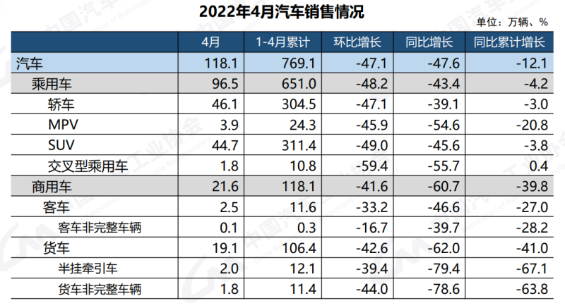 中國儲能網(wǎng)訊:5月11日,中國汽車工業(yè)協(xié)會(以下簡稱“中汽協(xié)”)發(fā)布的最新一期產(chǎn)銷數(shù)據(jù)顯示,2022年4月,我國汽車產(chǎn)銷明顯下降,當(dāng)月分別完成120.5萬輛和118.1萬輛,環(huán)比下降46.2%和47.1%,同比下降46.1%和47.6%。