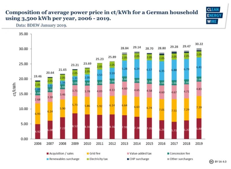 中國儲能網(wǎng)訊:根據(jù)德國能源和水業(yè)協(xié)會(BDEW)的數(shù)據(jù),2019年德國三人的普通家庭平均每年耗電3,500千瓦時,每月電費為88.1歐元(約合人民幣690元)。這個電費的 名義價格比1998年高出約77%,但如果按通貨膨脹調(diào)整則增幅為33%。德國家庭電費增長的最主要原因是可再生能源附加費的引入。