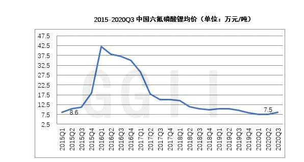 然而不及預期的是,新能源汽車補貼的滑坡,動力電池價格向下,疊加六氟磷酸鋰新增產(chǎn)能的集中釋放,市場供過于求致使六氟磷酸鋰價格一路暴跌,至2020年Q3下探至7.5萬元/噸。