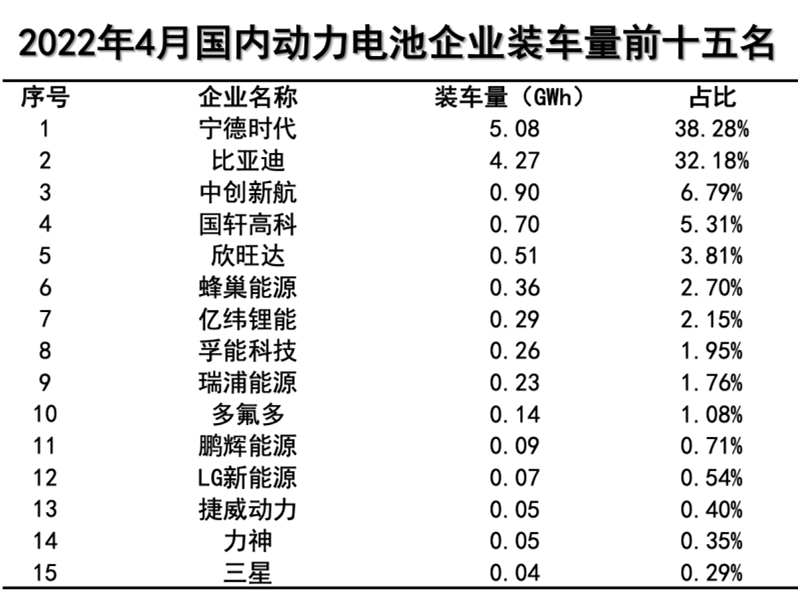 4月份國內(nèi)動(dòng)力電池裝機(jī)量TOP15的企業(yè)分別是:寧德時(shí)代、比亞迪、中創(chuàng)新航、國軒高科、欣旺達(dá)、蜂巢能源、億緯鋰能、孚能科技、瑞浦能源、多氟多、鵬輝能源、LG新能源、捷威動(dòng)力、力神、三星。