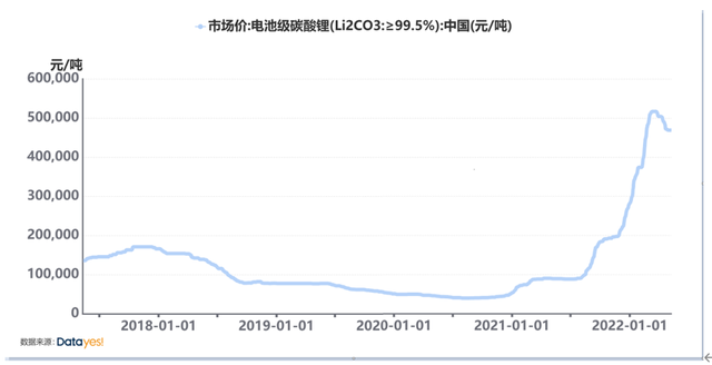 而在新能源車企涉足上游鋰礦資源的背后,則是近年來碳酸鋰價格的瘋狂上漲。通聯(lián)數(shù)據(jù)Datayes!的統(tǒng)計顯示,2021年1月份時,電池級碳酸鋰的價格僅為5.3萬元/噸,到2022年3月份,達到驚人的51.65萬元/噸,漲幅接近10倍;即使4月份開始有所回調(diào),但截至5月10日,仍高達46.9萬元/噸,近一年的漲幅為420%。