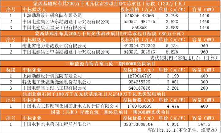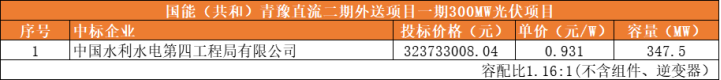 3月8日,中國水利水電第四工程局有限公司以單價0.931元/W的價格中標(biāo)了國能(共和)青豫直流二期外送項目一期300MW光伏項目,該項目采購不含組件、逆變器等重要設(shè)備。