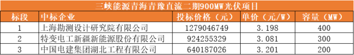 2月18日,三峽能源青海青豫直流二期3標(biāo)段1000MW光伏光熱項目900MW光伏項目EPC總承包中標(biāo)候選人公示。項目總共分為三個標(biāo)段,其中,上??睖y設(shè)計研究院有限公司以單價3.198元/W中標(biāo)第一標(biāo)段;特變電工新疆新能源股份有限公司以單價3.081元/W中標(biāo)第二標(biāo)段;中國電建集團(tuán)湖北工程有限公司以折合單價3.201元/W中標(biāo)第三標(biāo)段。