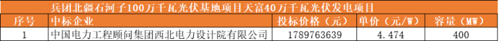 4月28日,兵團(tuán)北疆石河子100萬千瓦光伏基地項目天富40萬千瓦光伏發(fā)電項目設(shè)計采購施工一體化總承包中標(biāo)公示。中國電力工程顧問集團(tuán)西北電力設(shè)計院有限公司以折合單價4.474元/W拿下此項目。