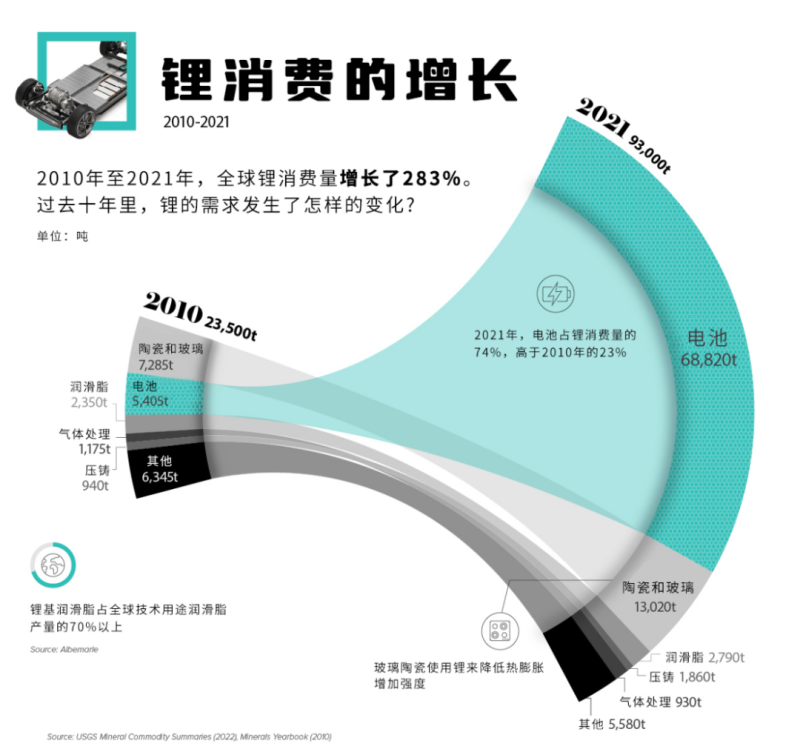 由于鋰在清潔能源技術(shù)中的應(yīng)用,自2010年以來,鋰的消費(fèi)量幾乎增長(zhǎng)了4倍。不但需求增加了,用途也發(fā)生了變化。以往鋰最大的用途是陶瓷和玻璃制造業(yè)。在陶瓷和玻璃器皿的涂層中添加碳酸鋰可以減少熱膨脹,這對(duì)于現(xiàn)代玻璃陶瓷灶具來說是必不可少的。但在這十年間,電動(dòng)汽車發(fā)展迅速,占全球汽車市場(chǎng)份額從2010年的0.01%飆升至2021年的8.6%。這對(duì)電池產(chǎn)生了巨大的需求,目前電池用鋰占全球鋰消費(fèi)量的近四分之三。隨著電動(dòng)汽車的普及,本世紀(jì)20年代或許是標(biāo)志著鋰消費(fèi)增長(zhǎng)的又一個(gè)十年。多個(gè)國家已經(jīng)承諾到2030年逐步淘汰內(nèi)燃機(jī)汽車,大眾、通用和福特等大型汽車制造商都在計(jì)劃推出新的電動(dòng)汽車。鋰的消耗量預(yù)計(jì)會(huì)持續(xù)增加,到2025年,電池消耗的鋰將占鋰總產(chǎn)量的84%。