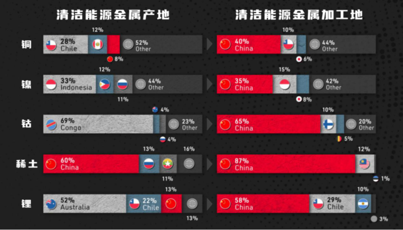 中國產(chǎn)出了全球60%的稀土元素,這些元素被用于制造電子設(shè)備,包括智能手機(jī)和電腦。鋰的生產(chǎn)市場(chǎng)份額由澳大利亞(52%)和智利(22%)主導(dǎo),中國占有約13%。清潔能源金屬加工業(yè)務(wù)方面,中國占比較高,鎳、鋰、鈷和稀土元素加工比重分別為35%、58%、65%和87%。