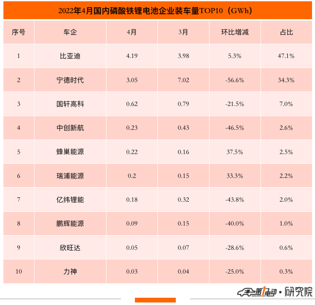 磷酸鐵鋰方面,4月,比亞迪裝車量4.19GWh,環(huán)比上漲5.3%,市占率提升至47.1%,今年以來首次超越寧德時代奪冠;寧德時代裝車量3.05GWh,環(huán)比下降56.6%,市占比下降19個百分點(diǎn)至34.3%。