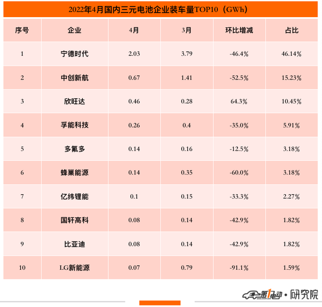 三元電池材料方面,4月寧德時代裝車量2GWh,環(huán)比下降46.5%,占比46%,位居冠軍,中創(chuàng)新航裝車量0.67GWh,環(huán)比下降52.5%,占比下降2個百分點(diǎn)至15.23%,位居第二,欣旺達(dá)裝機(jī)量0.46GWh,環(huán)比大漲64.3%,占比提升近7個百分點(diǎn)至10.45%,排名提升3個名次至第三。