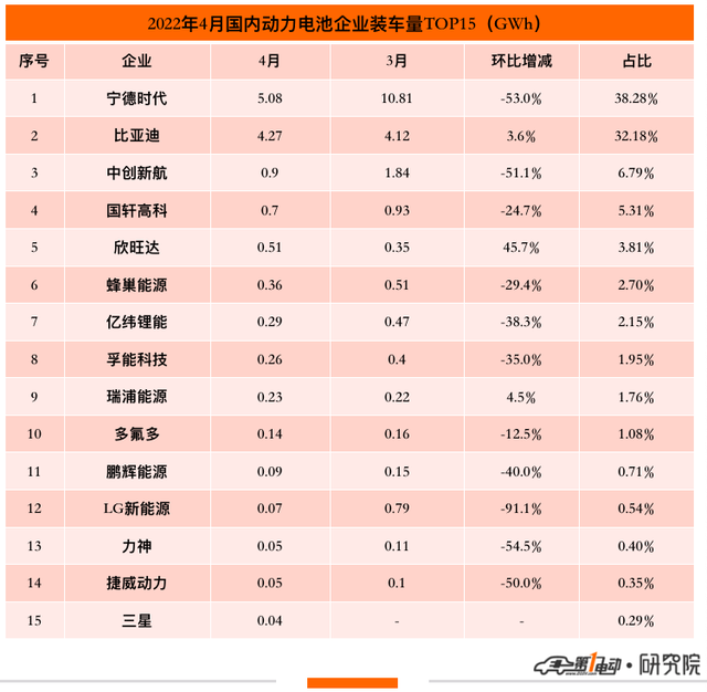 最重要的變化是,寧德時代市占率嚴(yán)重下滑,從3月(50%)下降十二個百分點(diǎn)至4月38%,而比亞迪逆勢大漲,市占率從3月(19.24%)提升近十三個百分點(diǎn)至32.18%。