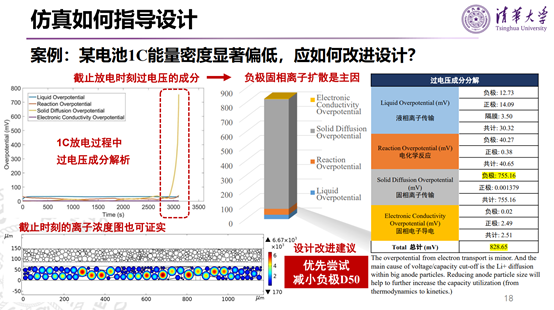 上面都是一些典型的仿真結果。仿真為什么能知道設計呢?或者為什么第二代電池產品的研發(fā)技術是仿真驅動的正向設計呢?我們來看一個案例。這個案例來源于一個特定的設計需求,如果一款電池在1C條件下,能量密度顯著偏低,能不能幫我們分析一下成因,應該如何改進一下這個設計呢?