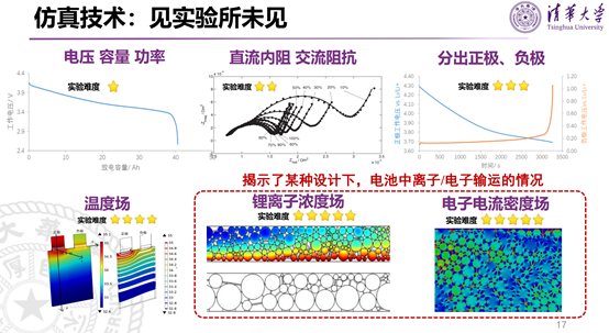 比如這張圖中,根據這個實驗難度星數從一到五,可以簡單獲得比如電壓、容量、功率,直流內阻、交流內阻,通過三電極或者半電池的方法把正負極的電位區(qū)分開;下面一排實驗難度在快速的增加,比如大的電池,尺度很大、厚度很大,如何把整個內部,包括封閉結構內部和外部的溫度都能夠采集出來呢?實驗上有一定的困難,但是并不是不可行。仿真的結果可以告訴我們,溫度在時、空兩重維度下任意時間、電池內外任意位置的溫度變化情況。后面我們加了五星的兩張圖,分別代表在任意時刻下,比如左邊圖是正極固相材料內部的鋰離子濃度,右邊圖是電子電流密度場。大家知道,這兩個物理參數很難通過實驗室測試的方法滿足在一定的時間和空間分辨率條件下精準的獲得,因此仿真技術可以幫我們見到一些在實驗中不容易見到的現象,從而更有可能揭示出電池內部發(fā)生的一些特定機理,并把這種機理與設計瓶頸及如何進一步改進設計關聯起來。