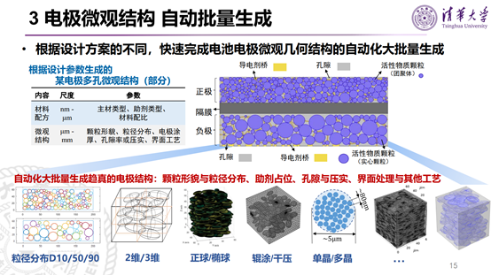 右上角是一個典型的某一個電極的多孔的微觀結構。事實上這個結構不是唯一的,它與很多關鍵假設,包括輸入的設計參數是密切相關的??梢钥吹较旅孢@些圖,可以表征不同的粒徑分布:D10、D50、D90;可以是兩維的、也可以是三維的;單個顆??梢允钦蛐蔚?、也可以是橢球形的,甚至是片狀的;它可以適配很多工藝,傳統(tǒng)的涂布輥壓烘干工藝,包括現在干壓的工藝;在正極它可以表征出單晶的結構,也可以表征出有些材料中使用的多晶結構等等。因此這種自動化大批量生成的電極結構,可以反映電池內部很多趨于真實的信息:比如顆粒不同的形貌、不同粒徑分布的特點;助劑、導電劑、黏結劑真正的空間占位;孔隙分布的情況、壓實密度的情況,包括電池內部非常豐富的界面上進行的各種各樣的工藝處理等等。