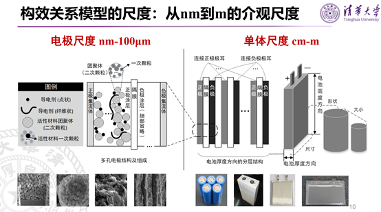 在這個構效關系模型里,至少要涵蓋兩個核心尺度,第一是電極的尺度,電池的正極材料、負極材料,包括其中的導電劑、黏結劑等各種各樣的助劑,它們構成的多孔電極是第一個關鍵尺度,它的特征尺寸是,從單個顆粒一直到整個電極單面涂層的厚度一般在百微米以下。