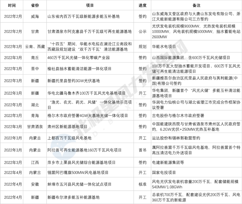 據(jù)北極星風(fēng)力發(fā)電網(wǎng)統(tǒng)計(jì)整理,自2022年2月份以來,山東、河南、新疆、江西等省份新簽約、新開工的大基地項(xiàng)目近20個(gè),其中不乏像甘肅“阿克塞縣千萬千瓦級可再生能源基地”和酒泉市“肅州區(qū)新能源6.2GW光伏+250MW光熱互補(bǔ)基地”這樣的超大型項(xiàng)目。