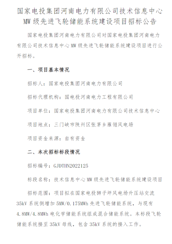 中國儲能網(wǎng)訊:5月18日,國電投河南電力工程有限公司發(fā)布MW級先進飛輪儲能系統(tǒng)建設(shè)項目招標公告,項目擬在國家電投獅子坪風(fēng)電場升壓站交流35kV系統(tǒng)側(cè)增加5MW/0.175MWh先進飛輪儲能系統(tǒng),與現(xiàn)有4.8MW/4.8MWh電化學(xué)儲能系統(tǒng)組成混合儲能系統(tǒng)。