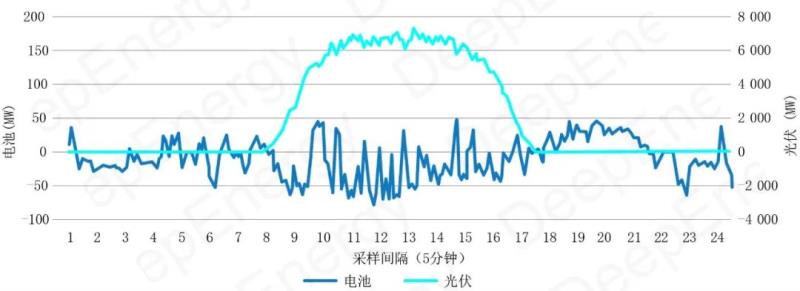 圖4 CAISO電網(wǎng)在2018年12月20日光伏發(fā)電和電池調(diào)度情況