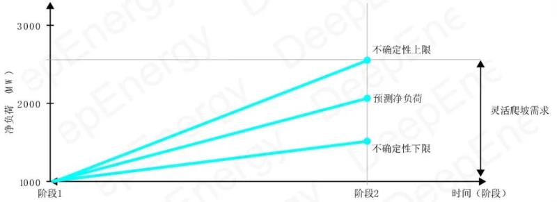 FRP是一種輔助服務(wù)并且常有兩個獨(dú)立的產(chǎn)品,一個是爬坡調(diào)節(jié),叫做靈活爬坡(FRU),另一種是降坡調(diào)節(jié),叫做靈活降坡(FRD)。這種產(chǎn)品可以綜合需求和VRE的調(diào)節(jié)要求,將凈負(fù)荷偏差考慮進(jìn)來,然后反映出調(diào)節(jié)預(yù)測的不確定性。在預(yù)測上,像電網(wǎng)系統(tǒng)其他備用要求一樣,F(xiàn)RP試圖將需求和VRE的預(yù)測偏差考慮進(jìn)來。圖3給出了一個示例,在給定凈負(fù)荷曲線和預(yù)測不確定度時,F(xiàn)RP的調(diào)節(jié)要求是怎樣的。