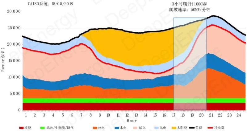 “鴨形曲線”已經(jīng)是加利福尼亞的主要負(fù)載特征曲線,加利福尼亞也是最早發(fā)生“鴨形曲線”的地方。但在美國其他地方,如新英格蘭州(Roselund,2018),也發(fā)現(xiàn)了類似曲線。為了治理凈負(fù)荷曲線,電網(wǎng)運(yùn)營商需要一種資源來快速動作,來調(diào)節(jié)電力生產(chǎn)并滿足陡峭的變化需求。在加利福尼亞,第一次爬坡調(diào)節(jié)發(fā)生在早上,從早上4點(diǎn)左右開始。
