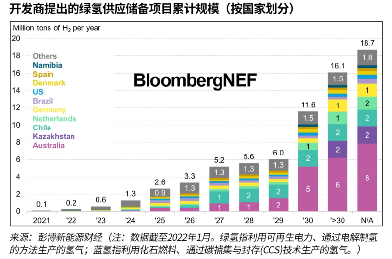 澳大利亞擁有豐富的可再生能源和化石燃料資源。根據(jù)彭博新能源財(cái)經(jīng)統(tǒng)計(jì),相關(guān)公司正利用上述優(yōu)勢(shì),提出年產(chǎn)能可能達(dá)到780萬(wàn)噸的綠氫項(xiàng)目。藍(lán)氫項(xiàng)目可能會(huì)使該年產(chǎn)能進(jìn)一步增加70萬(wàn)噸。