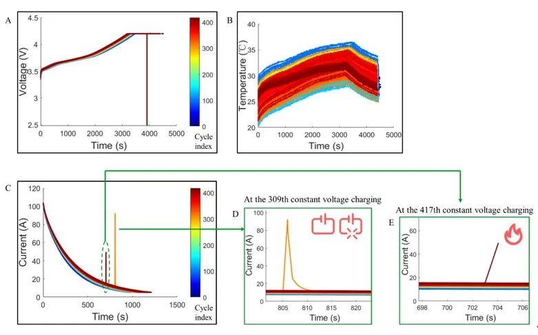 此外還發(fā)現(xiàn)有一個(gè)缺陷電池(電池C)在循環(huán)到第309圈時(shí)發(fā)生了內(nèi)短路熔斷現(xiàn)象,作者為了研究?jī)?nèi)短路熔斷電池的安全性,讓其繼續(xù)循環(huán),該電池在第417圈時(shí)發(fā)生了突發(fā)自燃,這說明發(fā)生過內(nèi)短路熔斷的電池依然具有再次內(nèi)短路的風(fēng)險(xiǎn),作者也提出了電池內(nèi)短路熔斷故障篩查和預(yù)警的方法,并建議對(duì)于已經(jīng)發(fā)生過內(nèi)短路熔斷的電池需要進(jìn)行報(bào)廢處理。