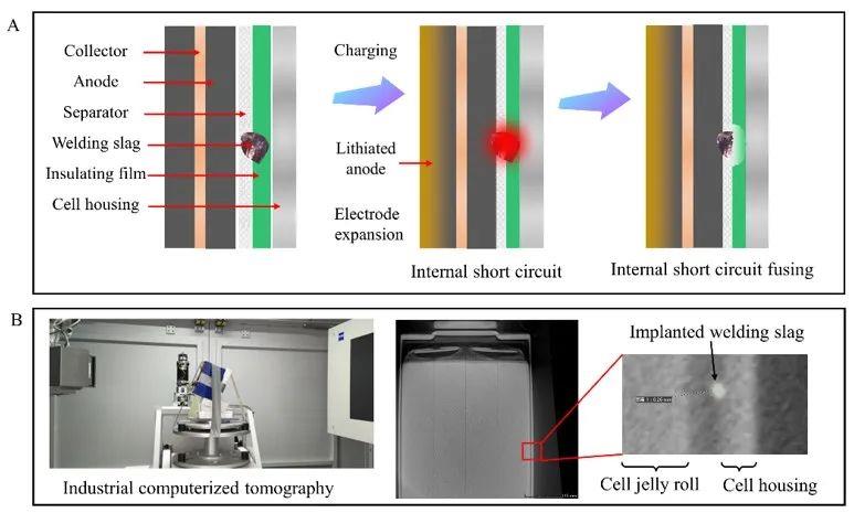 不同于以往用針刺、擠壓、過充、外短、泡水、外部加熱等濫用行為觸發(fā)的電池?zé)崾Э?,也不同于通過在電池內(nèi)部植入記憶合金、低熔點(diǎn)合金、石蠟等物質(zhì)(這些物質(zhì)不可能在電池實(shí)際生產(chǎn)制造過程中被混入)觸發(fā)的電池?zé)崾Э?,作者首次?fù)現(xiàn)了電池在正常使用情況下自引發(fā)的突發(fā)型熱失控,更加接近于實(shí)際生活中出現(xiàn)的電池突然自燃。另外,還復(fù)現(xiàn)了電池在正常使用情況下自引發(fā)的內(nèi)短路熔斷現(xiàn)象。這項(xiàng)研究證明了電池內(nèi)部特殊位置的顆粒雜質(zhì)異物缺陷是引發(fā)電池突然自燃的罪魁禍?zhǔn)?,揭示了異物缺陷引發(fā)電池內(nèi)短路和熱失控的演化過程和影響規(guī)律,提出了突然自燃的預(yù)警方法和防控方法。