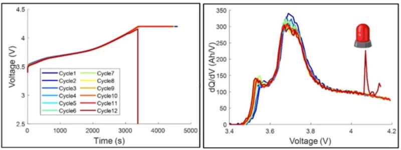 將在試制線上人為制作的缺陷電池進(jìn)行了常規(guī)老化循環(huán)充放電測(cè)試實(shí)驗(yàn),測(cè)試過程中無任何熱濫用、機(jī)械濫用、電濫用等操作,其中一個(gè)異物缺陷電池(電池A)在前11圈的循環(huán)中數(shù)據(jù)無異常,但在第12圈的恒流充電階段發(fā)生了突然自燃。如圖2所示,根據(jù)數(shù)據(jù)分析發(fā)現(xiàn),根據(jù)基于傳統(tǒng)一致性(單體間電壓差異、溫度差異、SOC差異等)的診斷算法無法實(shí)現(xiàn)早期預(yù)警,作者提出了一種面向電池全生命周期的安全預(yù)警方法,不受單體間不一致性的影響,根據(jù)該次實(shí)驗(yàn)結(jié)果表明可實(shí)現(xiàn)提前4分鐘的預(yù)警。