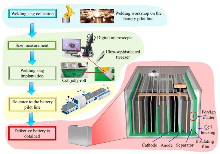 清華大學(xué)歐陽(yáng)明高院士團(tuán)隊(duì)與蜂巢能源科技股份有限公司多部門合作,從電池全生命周期管理角度出發(fā),對(duì)涉及電池安全的各個(gè)生產(chǎn)工序和使用環(huán)節(jié)進(jìn)行全面剖析和研究,重點(diǎn)就可能造成電池突然自燃的顆粒雜質(zhì)異物缺陷問題(焊渣、粉塵、顆粒雜質(zhì)等,粒徑一般在幾十到幾百微米級(jí)別)展開了研究。為了研究成果能夠指導(dǎo)產(chǎn)業(yè)實(shí)際,該項(xiàng)研究并不是在傳統(tǒng)實(shí)驗(yàn)室中進(jìn)行,而是選擇了在電池試制線上,并且是大容量動(dòng)力電池,而不是實(shí)驗(yàn)室中常用的微型電池。如圖1所示,在電池試制線上的一個(gè)裝配工序,人為故意在一些電池半成品中分別植入不同粒徑的異物后,重新投入試制線,并監(jiān)控這些人為制作的異物缺陷電池在試制線后續(xù)的所有數(shù)據(jù)和狀態(tài)變化。通過對(duì)出現(xiàn)異常情況的電池拆解,揭示了不同粒徑大小異物對(duì)電池的影響情況和規(guī)律。