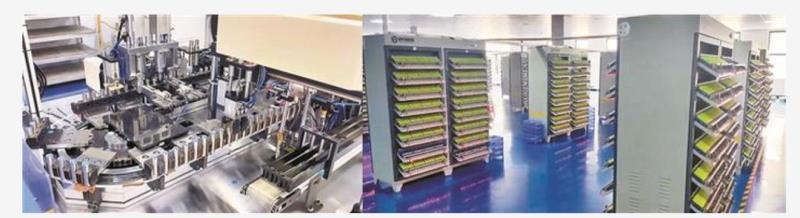 新型電池規(guī)?;a(chǎn)線局部(左)及批量測(cè)試(右)。