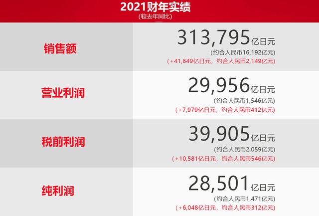 利潤方面,財報顯示,豐田汽車2021財年銷售額為31.38萬億日元(約合人民幣1.62萬億元),同比增長15%;純利潤為2.85萬億日元(約合人民幣1471億元),同比增長27%。