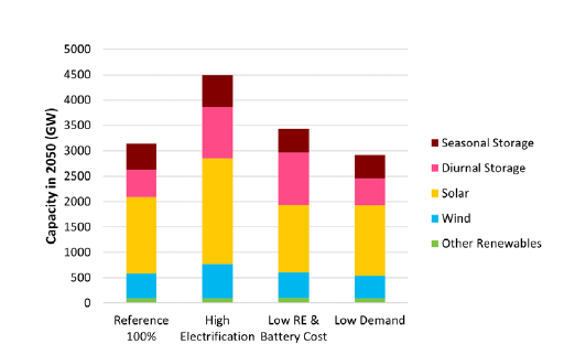 圖16顯示了另外一組案例的結(jié)果,評估了100%清潔能源情景。在這些情況下,使用可再生燃料(如氫氣)以燃?xì)廨啓C(jī)的形式模擬季節(jié)性儲能系統(tǒng)。在這些情景中,部署了大量(400GW以上)的季節(jié)性儲能系統(tǒng),證明了擁有能夠克服可再生能源發(fā)電和電力需求系統(tǒng)中季節(jié)性不匹配的技術(shù)價值。如果具有足夠的成本競爭力,其他季節(jié)性儲能系統(tǒng)技術(shù)也可以在其中發(fā)揮這一作用。